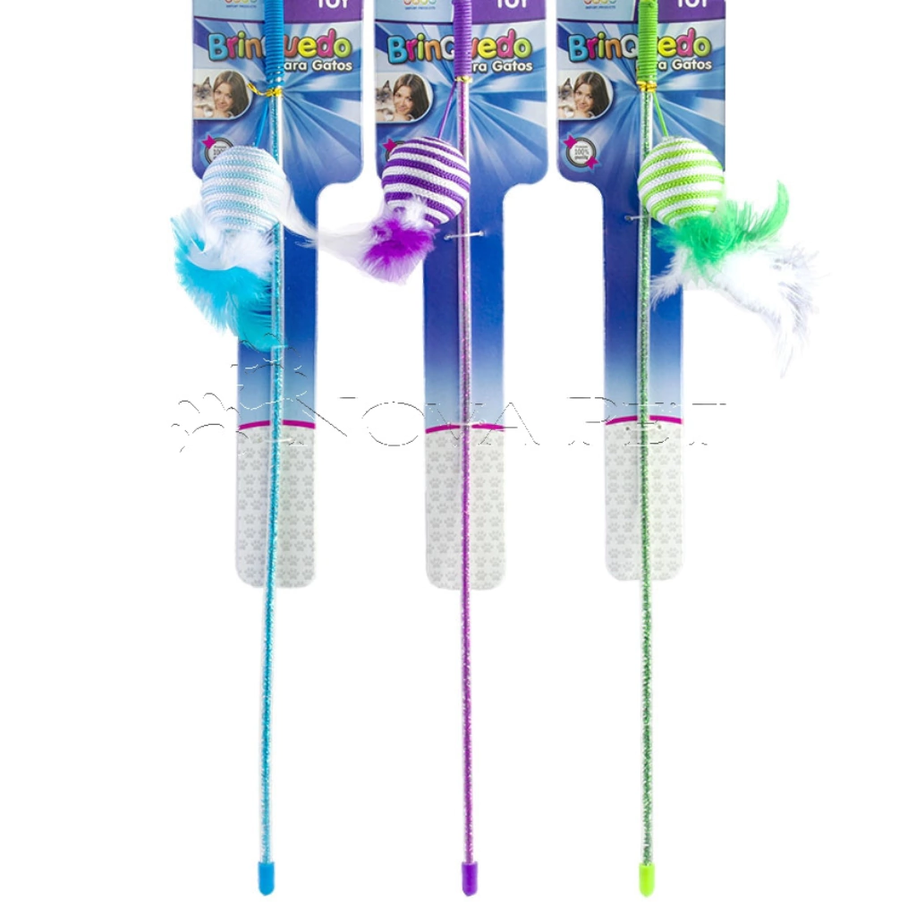 Composição: Fabricada em plástico, metal e penas sintéticas, a Varinha Pompom é resistente e segura, garantindo que seu gato possa brincar à vontade.