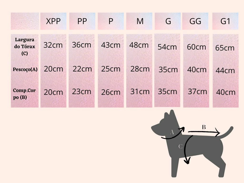 | Tamanho | Pescoço (cm) | Tórax (cm) | Comprimento (cm) |